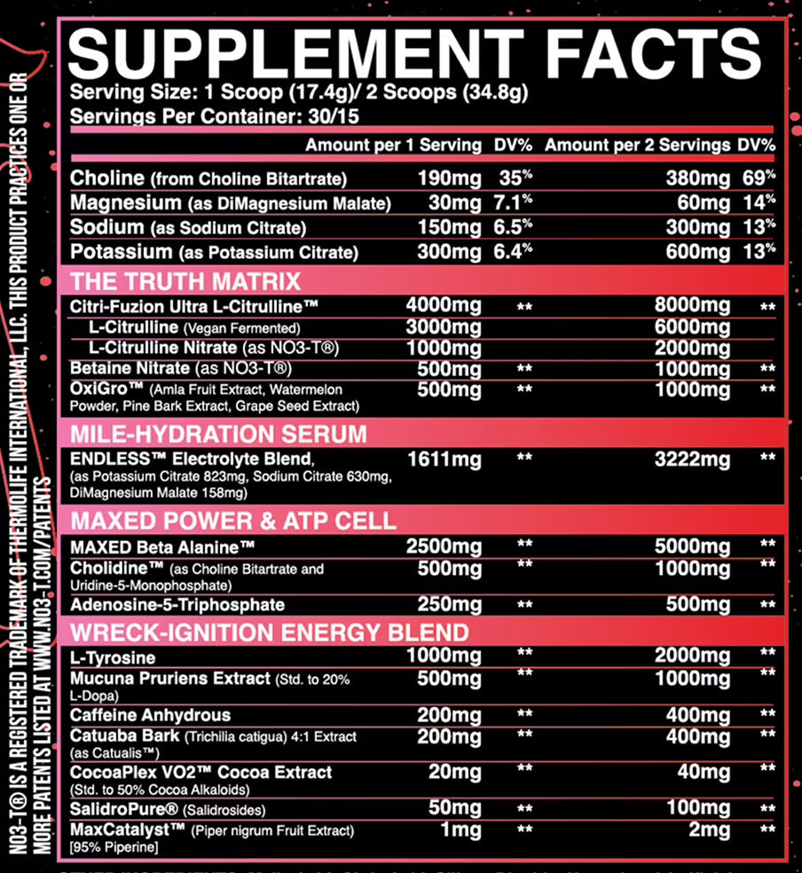 · 8g Citrulline w/ 2g Citrulline Nitrate (NO3-T®) → fuels endogenous arginine → NO synthase AND nitrate → nitrite → NO conversion.