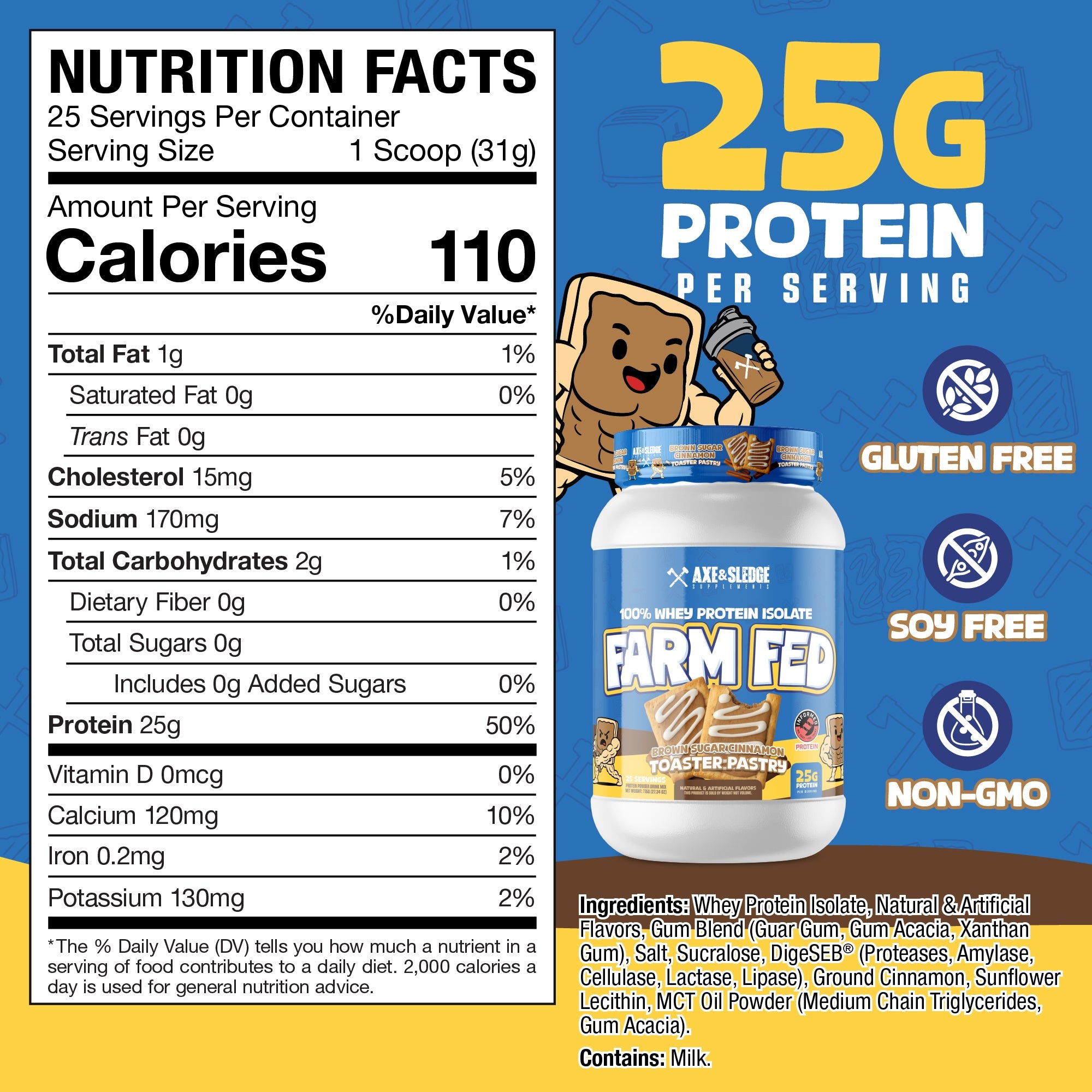 Fuel your muscles with Axe & Sledge Farm Fed Protein- a blend of high-quality, farm-raised and grass-fed whey protein isolate. With faster absorption and higher protein percentage than regular whey, this premium protein helps you achieve your fitness goals and build lean muscle.