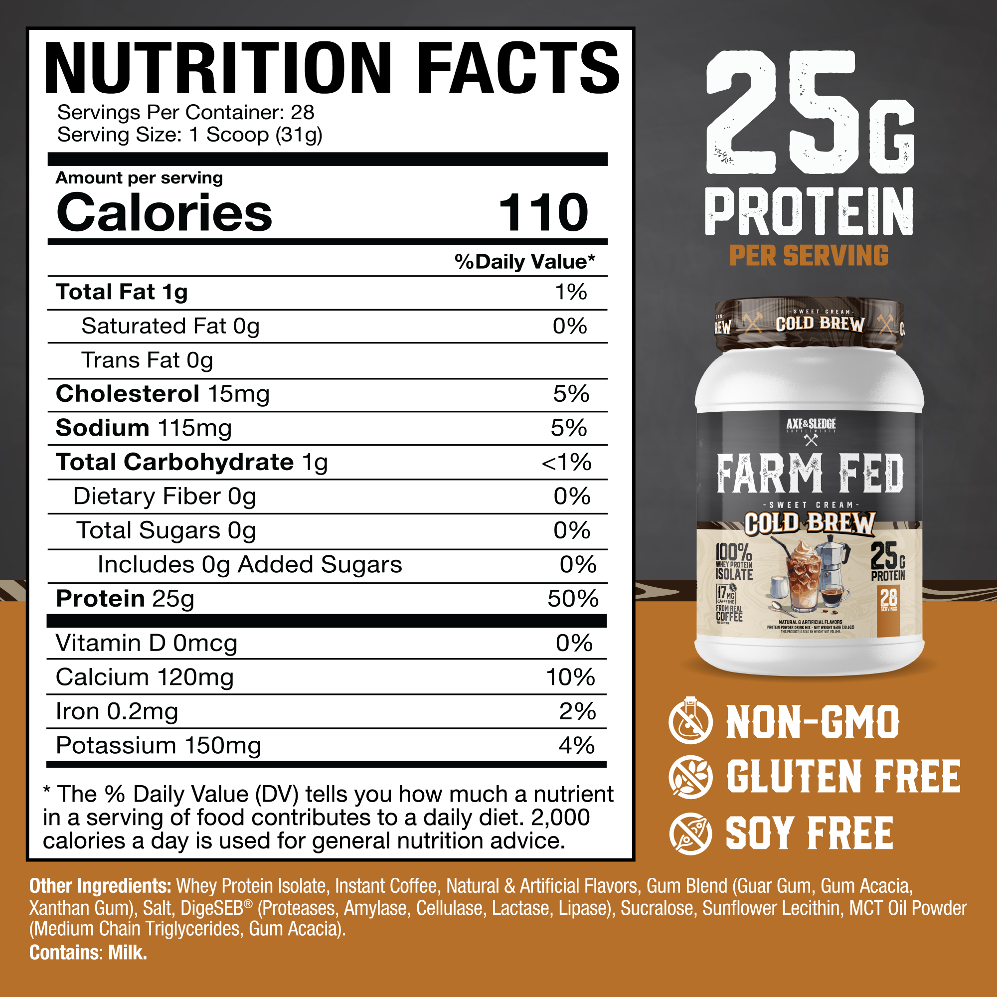 The advantage of Axe and Sledge protein is that Farm Fed contains grass fed whey which has better essential fatty acids and likely provides a cleaner and more nutrient-dense raw material for manufacturing. The added digestive enzymes further assist anyone who may have a digestive issue and you can feel safe knowing no antibiotics were used in these cows prior to milking the crap out of them.