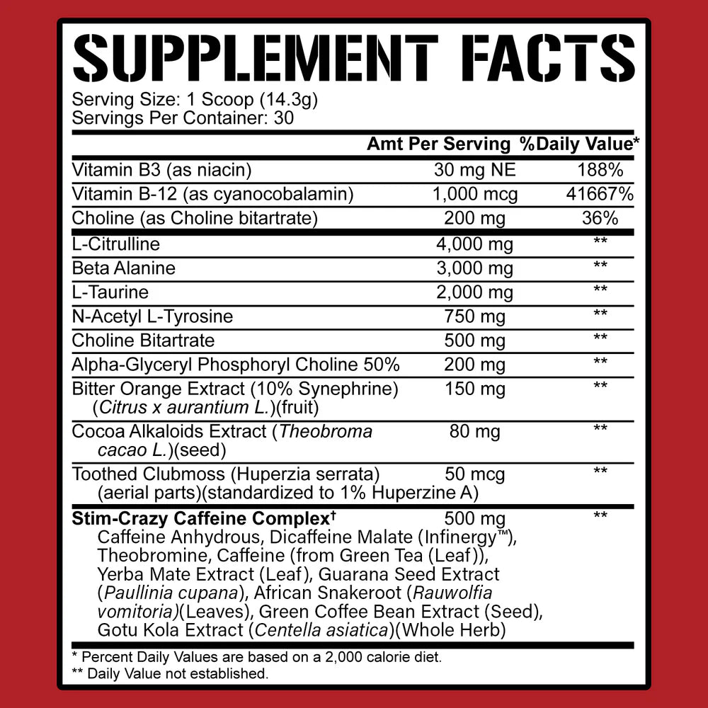 ✓ INTENSIDAD Y CONDUCCIÓN SIN JITTER: Nuestro complejo de cafeína Stim-Crazy ofrece 400 mg de cafeína de 8 fuentes diferentes, incluido di-cafeína malato de liberación prolongada y extractos de café, té verde, yerba mate, guaraná, yohimbina y centella asiática. ¡Conquista cada sesión con una intensidad inigualable!