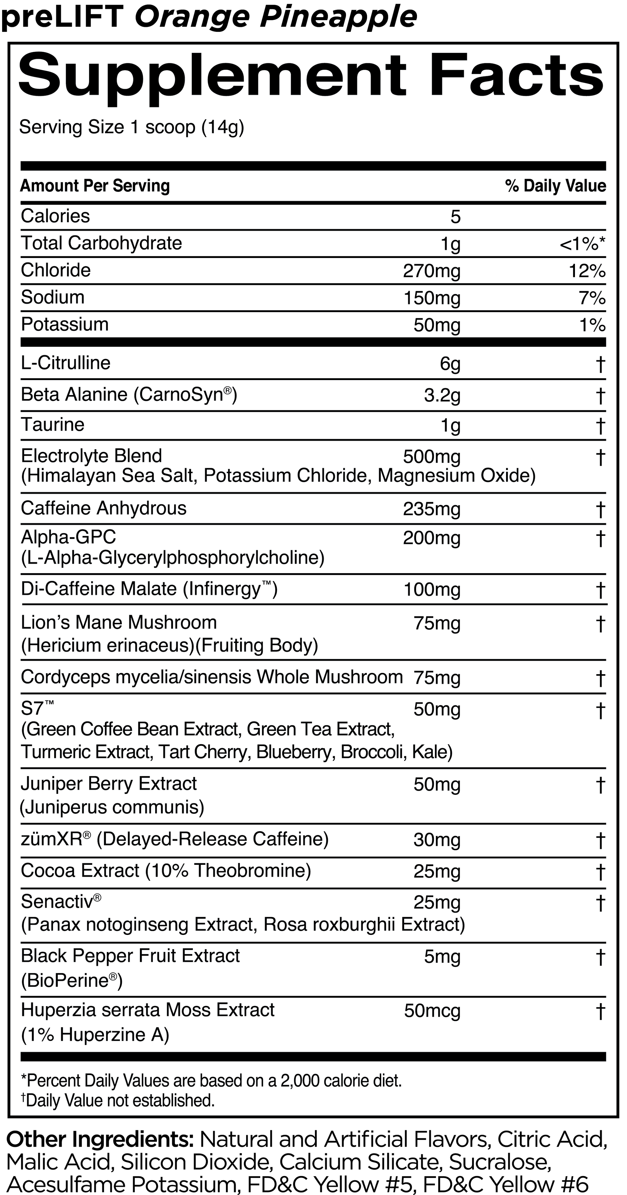 preLIFT™ was designed to help users prepare, and ultimately, prevail over any training challenge. Loaded with 25 different active ingredients including CarnoSyn® beta alanine, caffeine from faster and delayed-release sources, and patented Senactiv® phytocompound, each serving supports mental alertness, muscle endurance, and lasting energy. preLIFT™ also delivers pure l-citrulline and clinically researched S7™ for stronger pumps, alpha-GPC, huperzia extract, and lion’s mane mushroom for heightened focus, and four types of electrolytes to assist with hydration during extended workout sessions. It’s the complete preparation package, and our most advanced pre-workout to date.