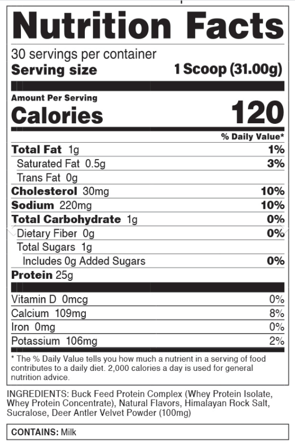 Experience the newest innovation from Buck Feed Original Protein, the ultimate post-workout and training fuel. Boost your recovery and maximize gains with Buck Feed Original Protein, packed with 25g of hormone-free whey protein and 100 mg of deer antler velvet powder extract.